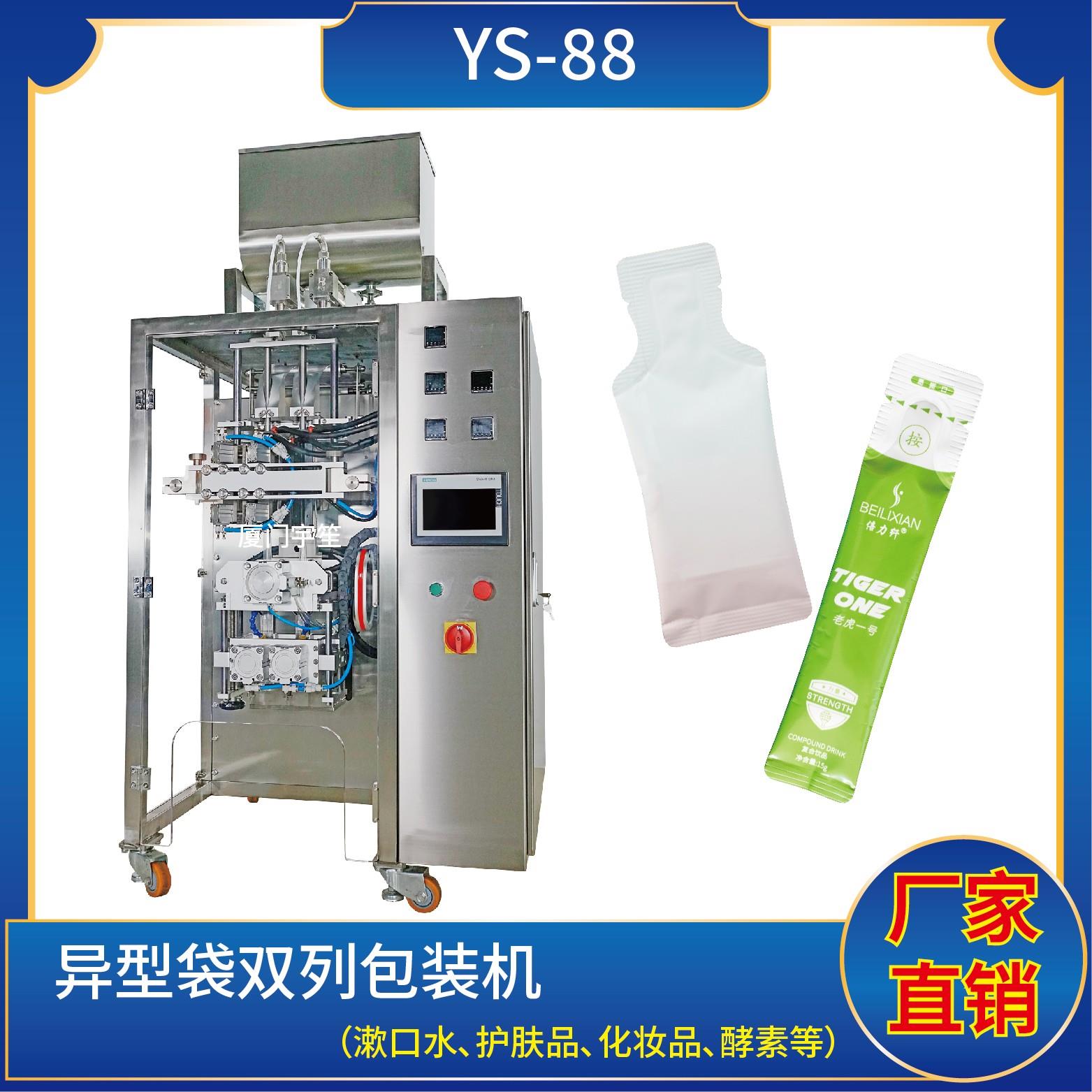 YS-88B 異形袋包裝機特 點 1、適用于食品、醫(yī)藥、化工、化妝品行業(yè)中液體、醬料等物品的異形袋計量包裝。2、可自動完成制袋、計量、下料、封合、分切、計數(shù)、且可根據(jù)客戶要求配置打印批號等功能。3、觸摸屏操作,PLC 控制,伺服電機控制袋長,性能穩(wěn)定、調(diào)整方便、檢測準確。智能式溫控儀,PID調(diào)節(jié),保證將溫度的誤差范…