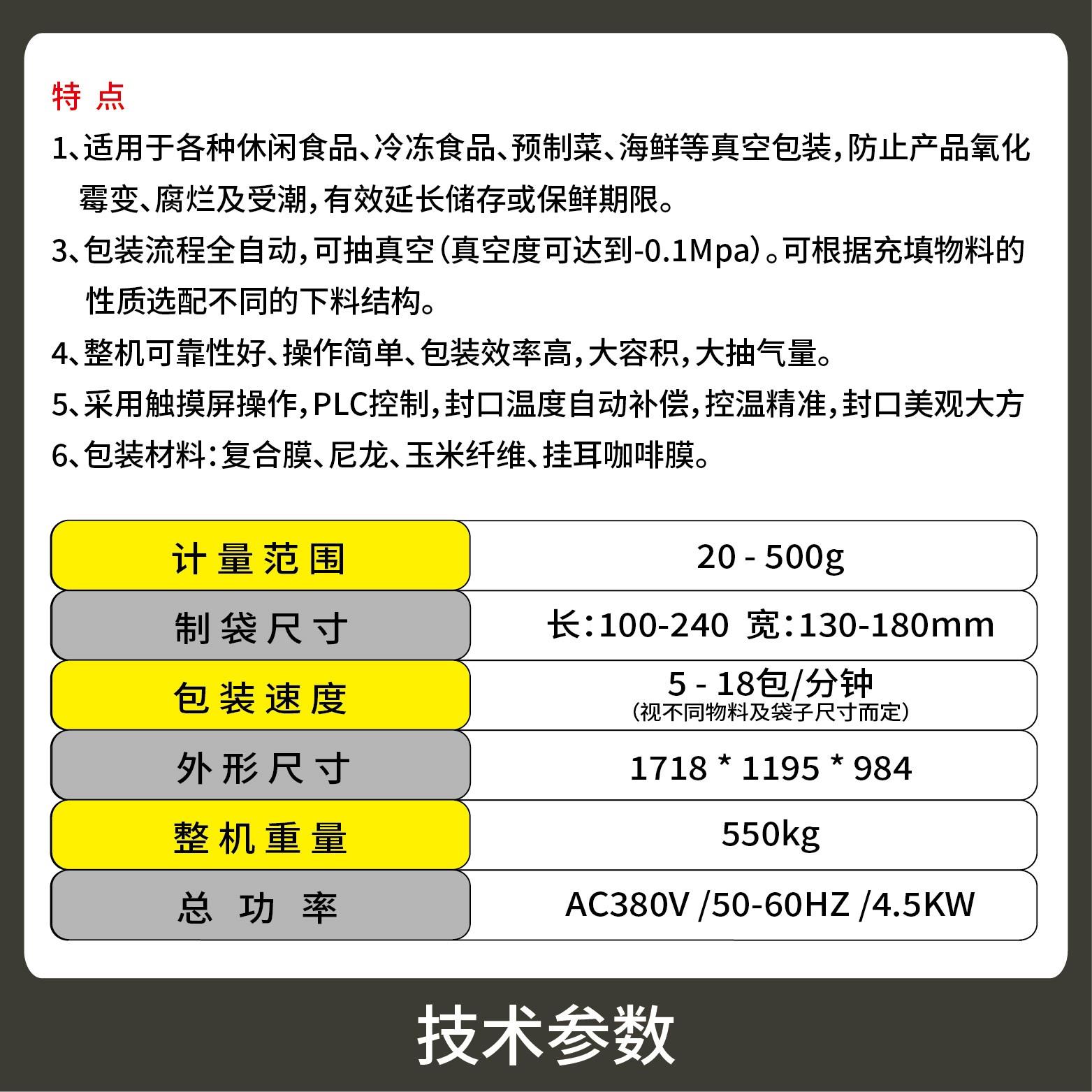 2、包裝流程全自動(dòng),可抽真空(真空度可達(dá)到-0.1Mpa)??筛鶕?jù)充填物料的性質(zhì)選配不同的下料結(jié)構(gòu)。